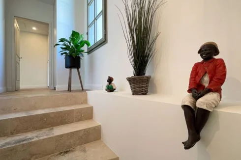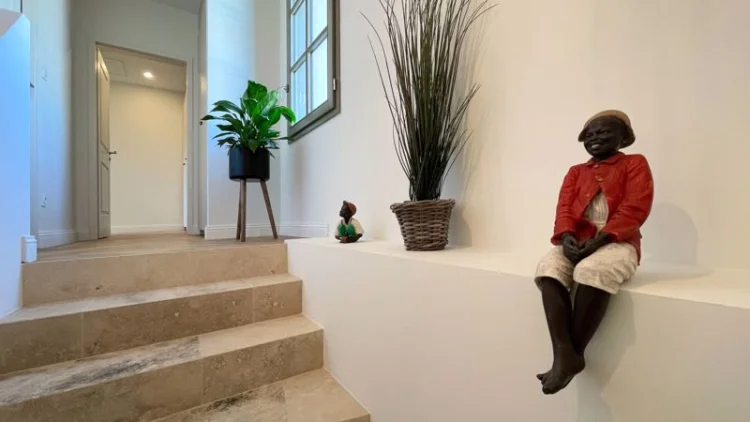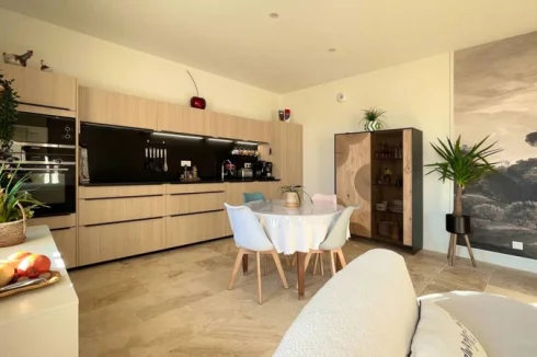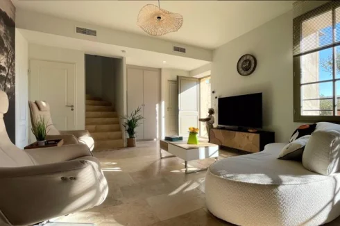 On the main floor, the bright living area welcomes you with high ceilings and plenty of morning light. The travertine floors add an authentic southern touch, and the open layout — living room, dining area, and fully fitted kitchen — makes it an easy, sociable space to enjoy with friends or family.