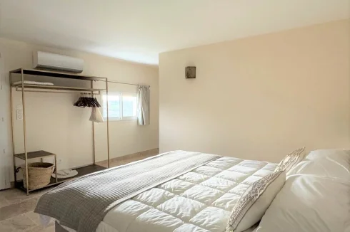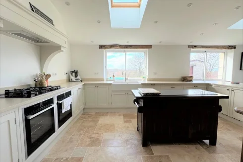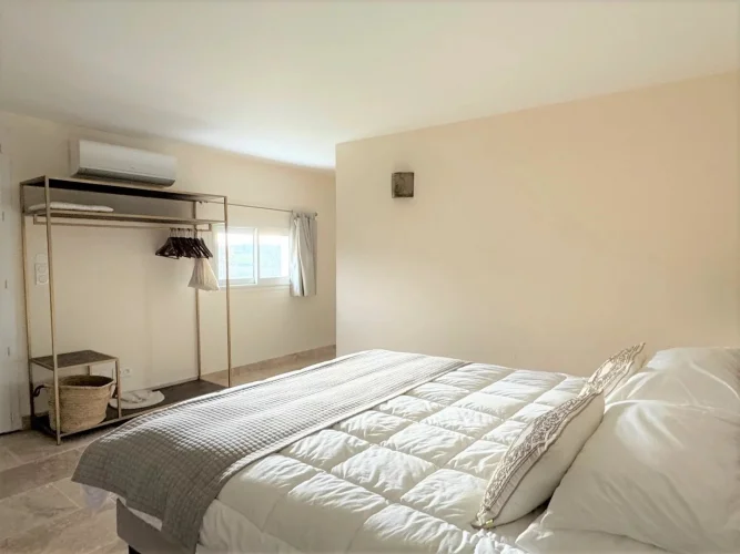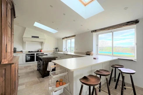 The main house features a spacious ground floor living room with entrance hall, kitchen, utility room, study, two master suites, storage space and, upstairs, a large mezzanine and a third suite.