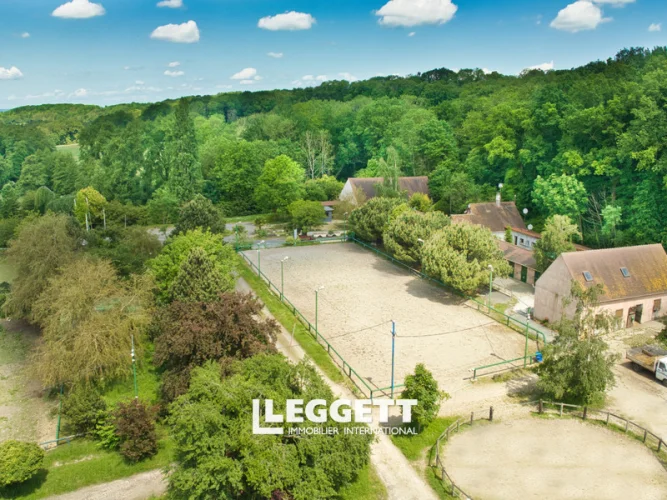 nestling between Bethemont la Foret and Taverny on 3.8 hectares of land on the edge of the Montmorency forest. virtual visit available on request. The facilities include a ground-floor building with a spacious clubhouse featuring a large fireplace, offices and a small kitchen. Upstairs is a F2 flat with a kitchen opening onto the living room, a bedroom and a shower room with toilet. The site also includes several buildings, including 2 studios for staff, boxes, riding arenas, paddocks and a large reception room.