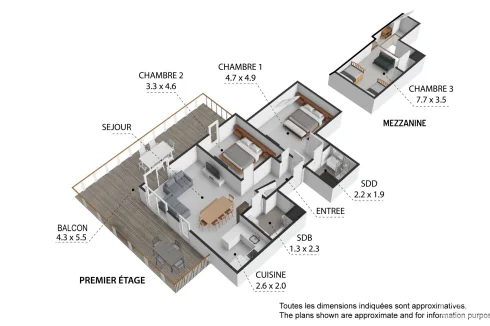 The property is sold fully furnished and comes with a double garage, cave and ski locker. It is a short walk, around 700m, 10 minutes from the village centre in the quiet “Freinets” area of the village.