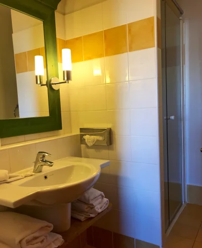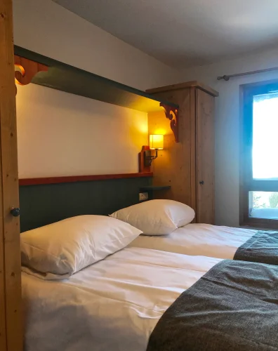 This is a charming 2 bedroom 55.5 m2 apartment with a spacious open-plan living room that comfortably accommodates up to 6 people. There is a ‘U shaped’ fully fitted kitchen, which is well equipped, and a dining area with a convenient fold down leaf allowing more space when not set up for family meal times! The apartment has two bedrooms: the master with a double bed and an en-suite bathroom, and a twin room with access to a separate WC and shower room.
