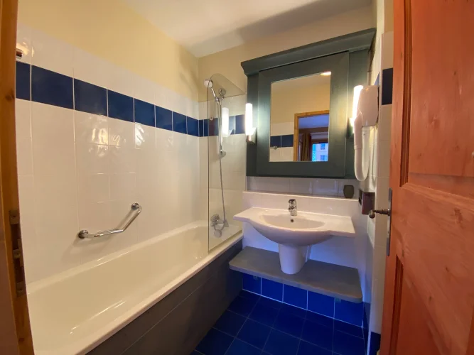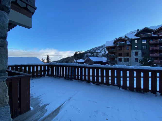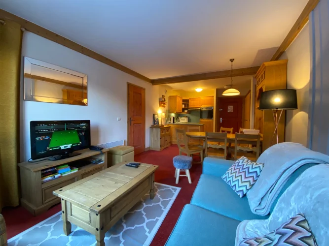 It is sold fully furnished and equipped and benefits from a modern fully fitted kitchen, connected to the open planned dining/living area, that leads to a 4,2 m2 east facing terrace. The master bedroom has its own en-suite bathroom with WC and bath for unwinding after a hard days skiing. The second bedroom, a twin, has access to a separate shower room and WC and benefits a private 4.2 m2 east facing terrace.