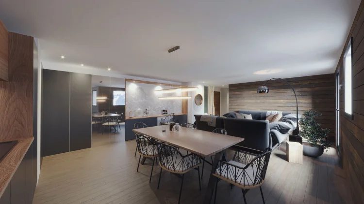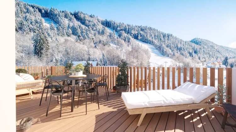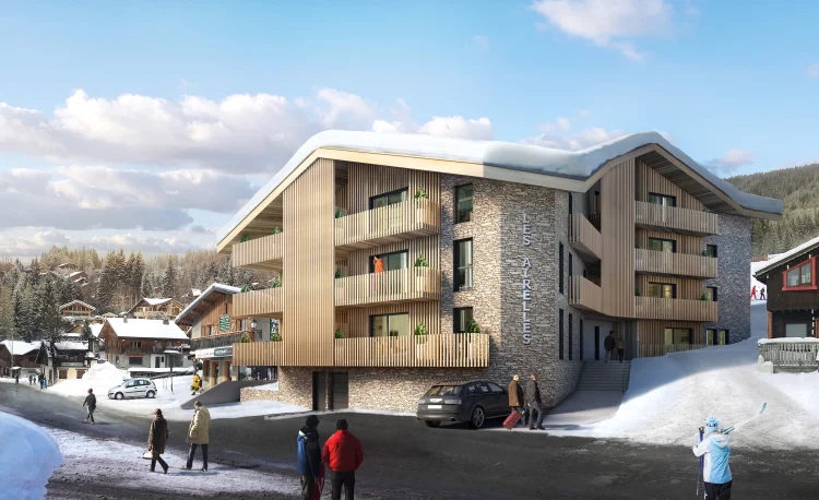 The French property for sale is a brand-new development that has contemporary yet traditional mountain architecture. The property has 19 apartments for sale that range between 1 bed+cab to 4 beds. All the properties benefit from exterior space in the form of balconies or terraces which boast unobstructed views over the village centre and the mountain environment. In addition, the apartments are sold with a ski locker, a cellar and a covered parking space.