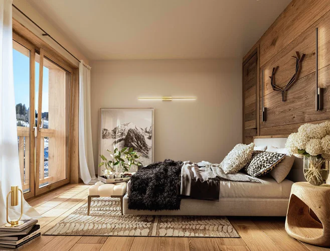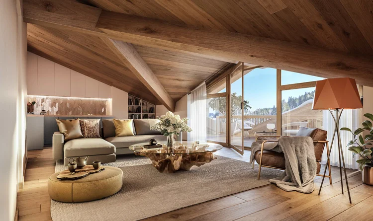 The pinnacle penthouses, including select duplex configurations, are defined by soaring cathedral ceilings that elevate the sense of space and sophistication. Inside, the interiors celebrate a contemporary Alpine aesthetic with artisanal wooden ceilings, bespoke headboards, and premium flooring. Owners have the unique opportunity to personalize their home with a curated selection of finishes tailored to refined tastes.