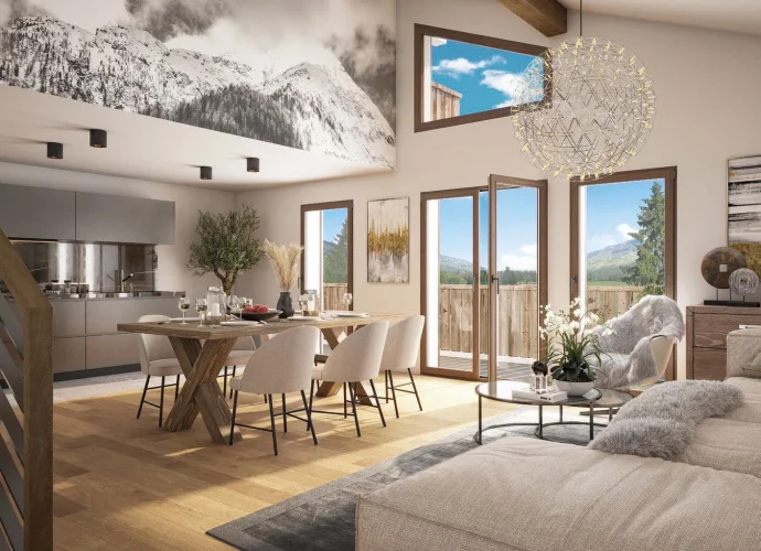 Welcome to the Sève residence, where a range of apartments awaits, from 1 to 4 bedrooms, including stylish duplexes. Combining Alpine tradition with contemporary flair, you'll find interiors that are both inviting and sophisticated, featuring top-quality materials and fittings. Thoughtfully designed, these residences boast spacious layouts, enhanced by expansive balconies, terraces, or private gardens, offering stunning views of Samoëns. Every detail is carefully considered, from practical amenities like cellars and ski lockers to basement parking. With its wooden and stone facades, grand terraces, and balconies, the Sève residence seamlessly integrates with the authentic charm of the Savoyard village.