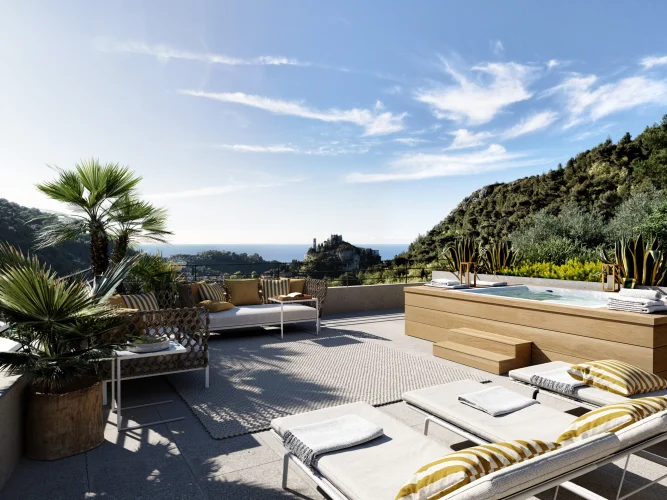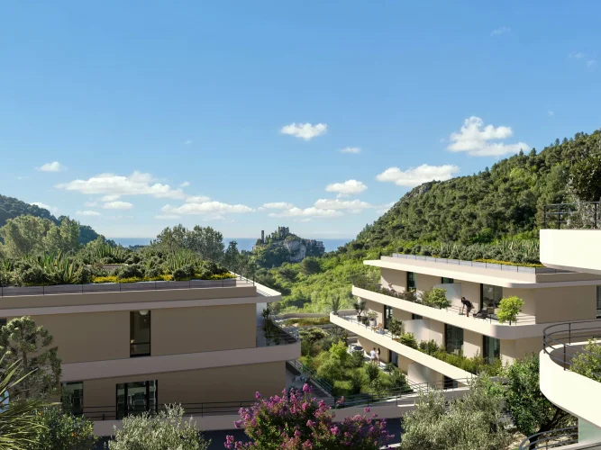 "BLUE RIVIERA" presents an array of exceptional apartments, ranging from studios to spacious 3 bedroom apartments, each boasting generous terraces. The development's sublime architecture offers breath-taking views of the village of Èze and the sparkling Mediterranean Sea.