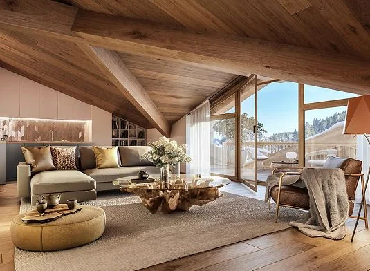 The pinnacle penthouses, including select duplex configurations, are defined by soaring cathedral ceilings that elevate the sense of space and sophistication. Inside, the interiors celebrate a contemporary Alpine aesthetic with artisanal wooden ceilings, bespoke headboards, and premium flooring. Owners have the unique opportunity to personalize their home with a curated selection of finishes tailored to refined tastes.