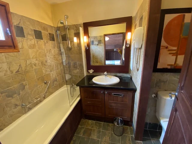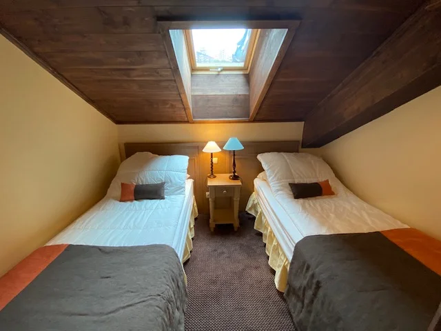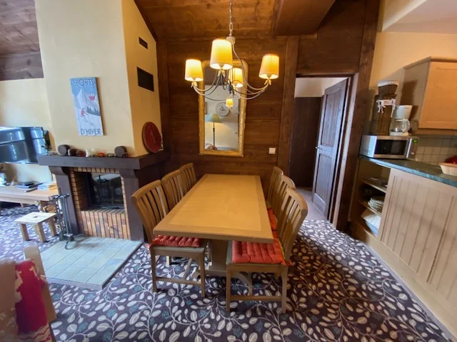 This spacious 2 bedroom apartment is situated on the top floor of Manoir Savoie, with fantastic views to both the south and east. The apartment has the luxury of being situated beneath the eaves of the building, with high ceilings and exposed beams. The living and dining areas are open plan and spacious, with a charming fireplace. There are large French doors that open out onto the lovely south east facing balcony – perfect for enjoying the magnificent views or some morning sunshine.