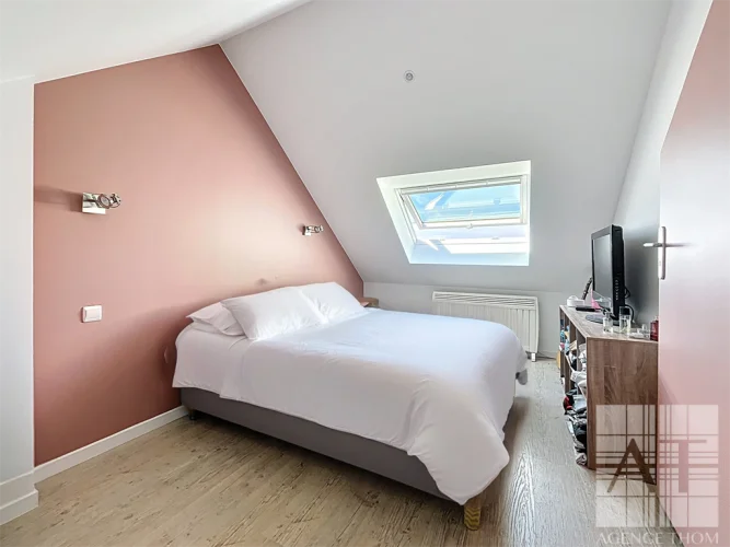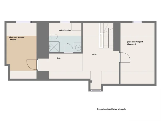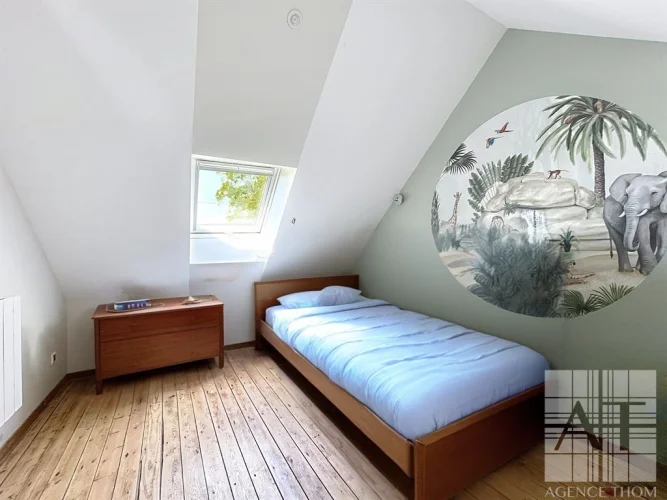 Upstairs, under the eaves, a landing leads to two attic rooms used as bedrooms and a shower room with toilet.