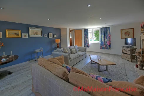 Entrance hall leads, on your left, to a large double aspect lounge with exposed stone walls and Charentaise fireplace with wood burning stove. To the right of the entrance hall is the fully fitted breakfast kitchen with tiled floor, Charentaise fireplace and pellet stove, window to the front and a good range of fitted units with an island with a breakfast bar. Office or hall with stairs upto first floor, window to the front and exposed stone wall. Laundry room and shower room.