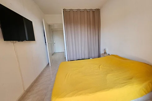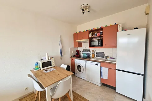 The apartment is composed of an entrance with cupboards, a kitchen open to the living room, a bedroom, a bathroom and separate toilet.