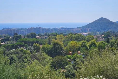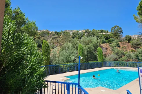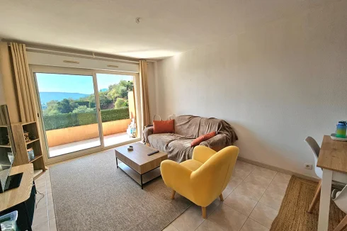 On the heights of Mandelieu, I exclusively offer you this beautiful 2-room apartment with sea view and large south-facing terrace.