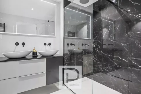 Spacious living room with open kitchen, 3 bedrooms with shower room/bathroom and toilet, and a guest toilet, a large 25m² terrace, and two balconies. Three parking spaces in the basement and a cellar complete this rare property.