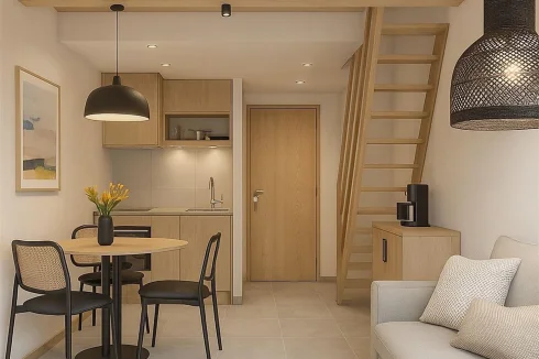 -A living room with exposed beams, French windows opening onto the balcony, and a sofa bed, all opening onto a fully equipped kitchenette with a refrigerator, stovetop, and various storage spaces.