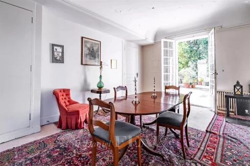 It includes a 42 sqm living/reception room with a fireplace, an adjacent 20 sqm drawing room, a dining room opening onto a 78 sqm south-west facing terrace, a kitchen with a pantry, and a bedroom with a bathroom. Upstairs are a bedroom with a bathroom, a master suite with a bathroom and ample fitted storage space, and a study or dressing room. A 4th bedroom and a shower room are on the top floor.