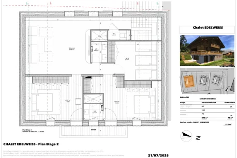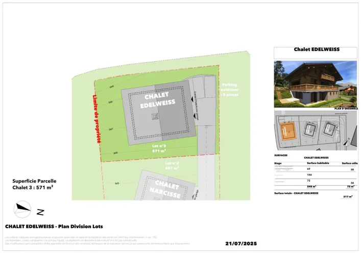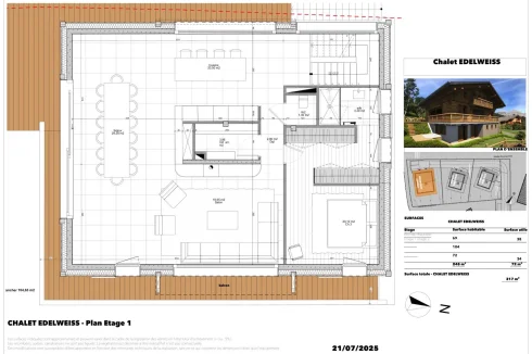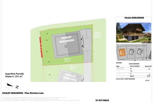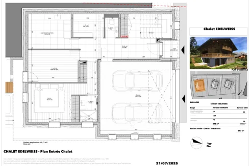 The chalet has a 36sqm double garage accessible from inside, as well as 3 outdoor parking spaces, 2 balconies and a beautiful 35sqm terrace overlooking the garden.