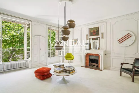 Harmonious, balanced volumes, high ceilings, moldings and fireplace.