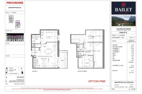 3 bedroom flat on a duplex top floor ! Other lots and floor plans are available on request ! Only 25 minutes from the A40 freeway linking Geneva and Chamonix, the village of Samoëns, a true haven of peace, is alive and kicking all year round thanks to its outdoor activities, local shops, school, doctor?s surgery, restaurants and Wednesday morning market. In 2021, this charming village was voted the most beautiful village in Haute-Savoie ! Living in this little corner of paradise is an opportunity not to be missed. It is in the heart of the Alps, in Haute-Savoie, that the Grand Massif slopes are revealed, between mythical spots, 40,000 hectares of forests, powder snow and grandiose views of the Arve Valley, the Aravis Massif, the Jura mountains up to Lake Geneva without forgetting the Mont-Blanc. Snow is guaranteed to make the most of the 139 trails and 62 lifts spread over 265 kilometers of trails that this area offers between 700 and 2,500 m altitude. This vast domain, which retains its simplicity and naturalness, will allow you to enjoy a total change of scenery thanks to its winter sports activities (alpine skiing, snowboarding, cross-country skiing, snowshoeing, biathlon, dog sledding, tobogganing, skating rink, etc.), its summer sports activities (hiking, biking, paragliding, tree climbing, miniature golf on the water, tennis, etc.), as well as its wealth of cultural heritage (chapels, chapels, oratories, and views). Discover an exceptional location : just an hour from Geneva, Chamonix-Mont-Blanc and the city of Annecy, L?Eloge du Poète is situated in the heart of the Grand Massif. L?Eloge du Poète is ideally located : Close to a school 10-minutes? walk from Samoëns town center 10-minutes? walk from the cable cars 3 minutes? walk from the free shuttle bus to the slopes 15-minutes? walk from Lac aux Dames and its leisure center So you?ll be free to leave your car in the parking lot if you like and enjoy the fresh mountain air ! By owning an apartment in our new residence, you?re choosing an exceptional ski area, and you?ll enjoy your apartment in all 4 seasons, thanks to its many activities. In summer, enjoy magnificent hikes between forests and mountain pastures? The mountains just a stone?s throw from your home? A real treat, isn?t it ? You?ll be able to enjoy the freedom of the paths and trails, as well as the splendid hikes around the surrounding lakes. In an exchange with the plot?s previous owner, we learned that Jean-Alfred Mogenet, a writer and poet from Samoëns, was one of his forebears and had lived on the family farm we?re rehabilitating, where he found inspiration and wrote his verses! One of his descendants, Rémi Mogenet, himself a literary man and poet, paid tribute to him in a book about his work. Jam?S poems, as he called himself, were written in the local dialect and expressed the events of his daily life, the peasant life of his time. Listening to this beautiful story, drawn from the local heritage and the land of this parcel, we wanted a name that would recall his talent and thus praise this distinguished village poet. The Bailet Group offers you top-of-the-range apartments facing Mont Criou, the ski resort?s emblematic peak. In addition to their optimized, functional layout, the apartments offer balconies or terraces so you can enjoy the stunning view. At the entrance, our interior designer will design the common areas, including porcelain stoneware tiling (to facilitate cleaning of areas used by bikes, skis, etc.) and decorative wall coverings. Wood or aluminum joinery, security glazing with videophone connected to each apartment (opening by code and badge, so you don?t have to take off your ski gloves, for example?). Have you always imagined your own little corner of paradise in the heart of the lively village of Samoëns ? Groupe Bailet can make it happen ! What better way to feel at home than to create the home you?ve always dreamed of ? Modifiable partitions, additional rooms, customizable kitchens, fully-equipped bathrooms and a wide choice of top-of-the-range materials? We?ll be happy to advise you and listen to your ideas to make your apartment the place you?ve always dreamed of ! The homes on offer, from a studio to 3 bedroom + Mountain Corner, are fully equipped and include top-of-the-range amenities with low-energy performance in line with the latest Re 2020 regulations. The apartments perfectly combine the spirit of the chalet with the modernity of the latest fittings. Authentic mountain style with wooden interior doors, smooth painted walls in all rooms, wood cladding on one wall of the living room, full-height earthenware tiles on the shower/tub walls and vanity unit, 60×60 cm tiles in the living room and glued parquet flooring with solid wood veneer in the bedrooms. Closets with imitation-wood sliding doors including interior fittings, Tv socket in living room and master bedroom. Fully fitted and equipped kitchen, functional bathrooms with thermostatic taps, chrome mixer tap and hand shower, vanity unit and illuminated mirror, electric towel dryer, wall-hung Wc with double expansion tank, humidity-sensitive single-flow ventilation. All apartments have one or two parking spaces, a cellar and a ski room equipped with boot warmers. The heating system and hot water production will be connected to the Samoëns district heating network. Hydraulic underfloor heating is planned in all the apartments. Attic apartments will be fitted with a metal flue for connection to a future wood-burning stove.