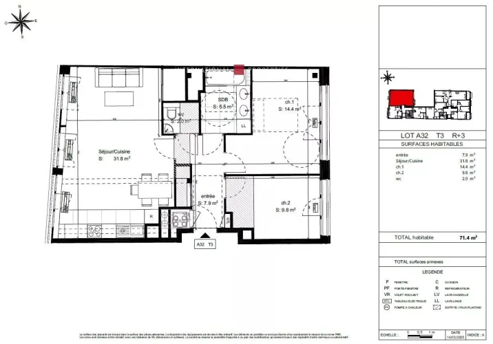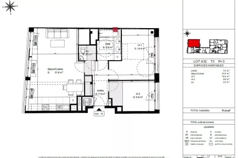 This brand-new 2-bedroom apartment (71.4 m²) is located on the third floor. Dual-Aspect and filled with natural light, it enjoys a west-facing view over the street and an east-facing view over the courtyard.