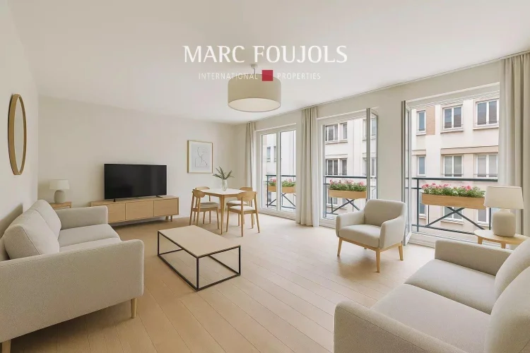 It comprises a large, bright double living room opening onto two southwest-facing balconies, a separate kitchen, two bedrooms, a bathroom, a shower room and plenty of storage space.