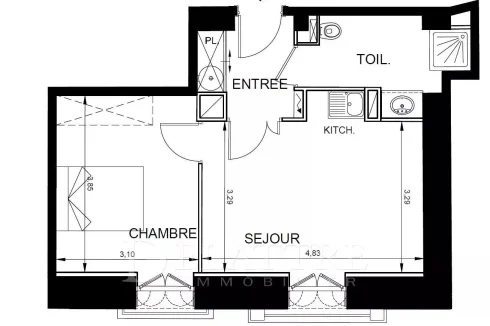 The apartment features a living room with a fully equipped open-plan kitchen (oven, cooktop, fridge, and dishwasher), one bedroom with built-in closet, and a shower room with toilet.