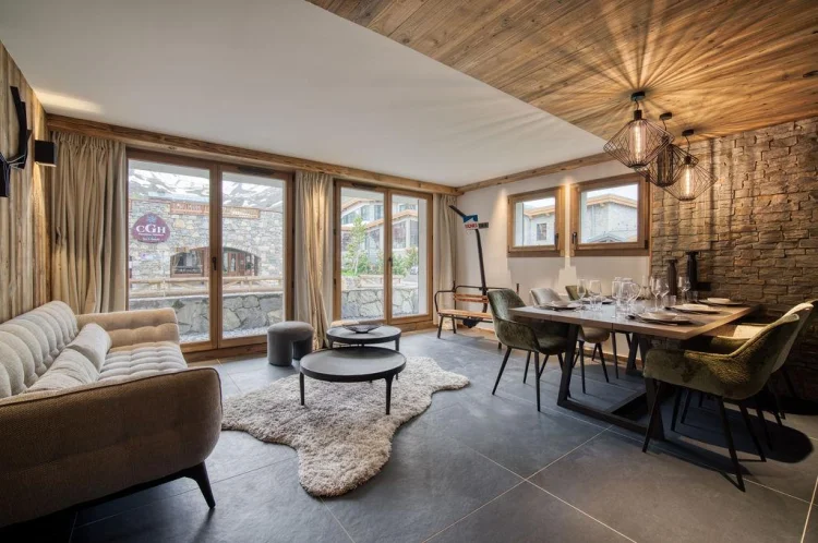 It comprises a private ski room, a large living room with open-plan kitchen, 2 en suite bedrooms, a 4-bed mountain sleeping area, a 3rd bathroom and a private terrace.