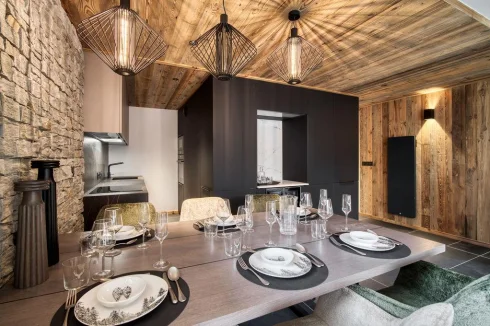 In a warm, contemporary ambience designed by professionals and created by Savoyard craftsmen, with an emphasis on noble materials (old wood, stone, lime plaster, wall hangings, etc.), you will appreciate the practicality and comfort of this well-equipped flat (fully-equipped kitchen, spirits bar with wine cellar, built-in wardrobes in all bedrooms, 3 bathrooms, etc.).