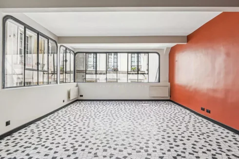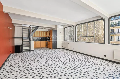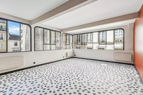 Third floor: spacious 36.5 m2 living room facing South and West, with open-plan fitted and equipped kitchen. Ceiling height 2.90 m.