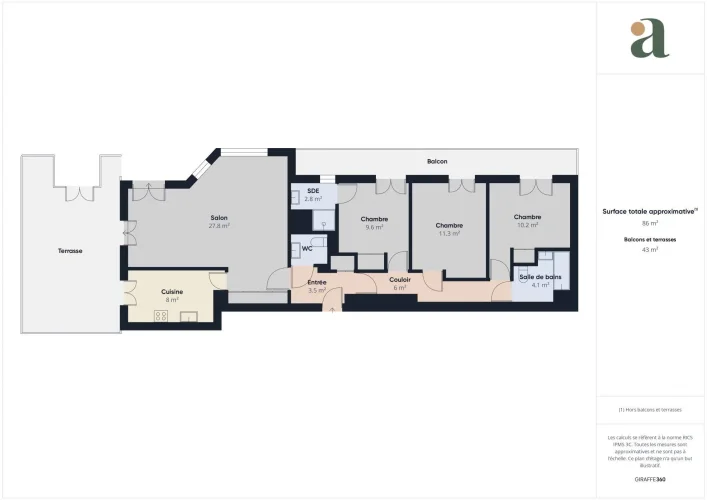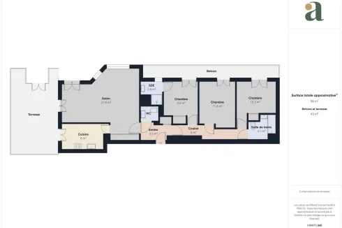 - Three bedrooms of between 9.6 and 11.3 m2, one with en-suite shower room, all 3 linked by a long balcony