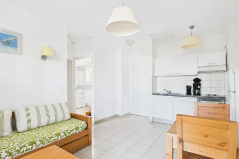 This bright two-room apartment of 34.50 m², located on the 1st floor of its building, offers an exceptional living environment in a secure residence by the sea with direct access to the beach.
