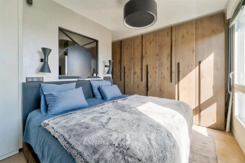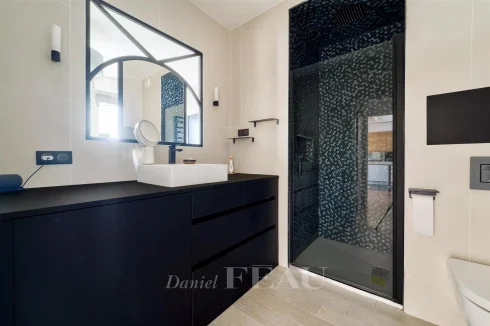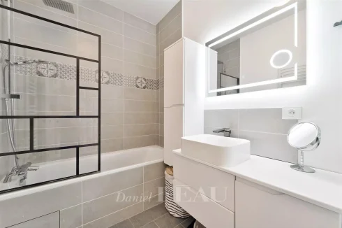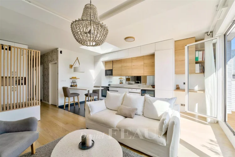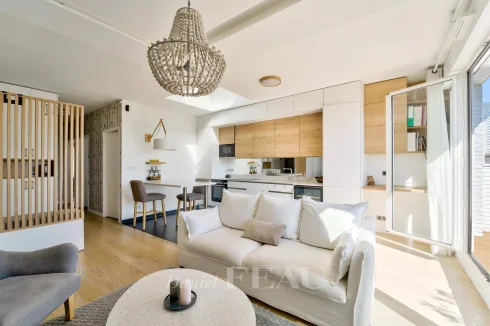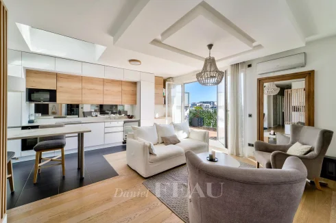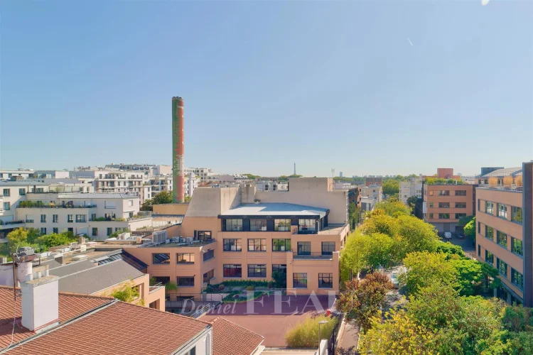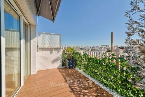 This bright 103 sqm apartment commanding a panoramic view of Paris is on the top floor of a luxurious recent building near the shops and transport networks on the north-western edge of the capital. It includes a spacious living/reception room bathed in sunshine, an open-plan kitchen (all opening onto a 13 sqm terrace enjoying a view of the Eiffel Tower), a master suite with a shower room/wc and bespoke storage space, three further bedrooms, a bathroom and a separate wc.