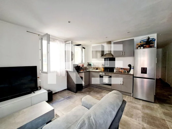 It is composed of a kitchen open to a living room, two bedrooms, a bathroom, a laundry room and a separate toilet.