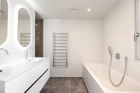 The fourth apartment, approximately 68 m², is equally impressive, featuring an entrance with a guest toilet and a living and dining area with an open-plan kitchen that leads directly to a terrace, offering easy access to the pool. It consists of two bedrooms, two shower rooms with toilets, and additional parking spaces.