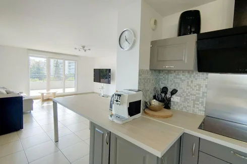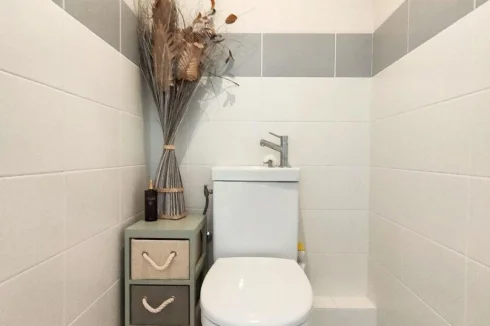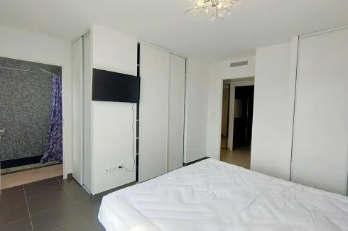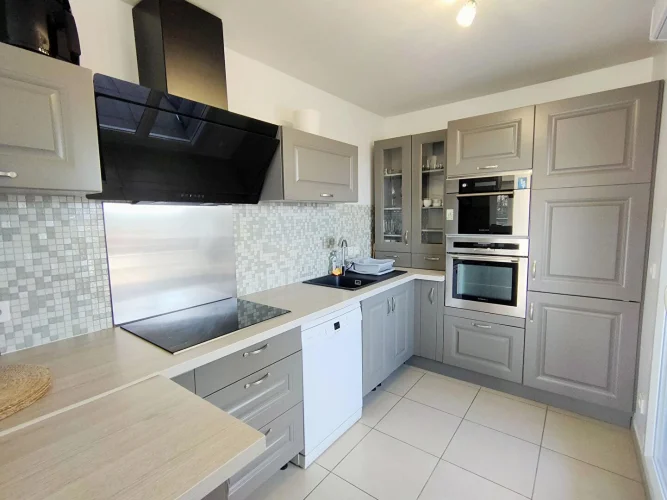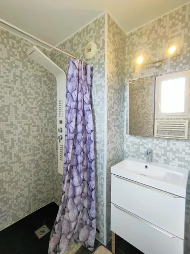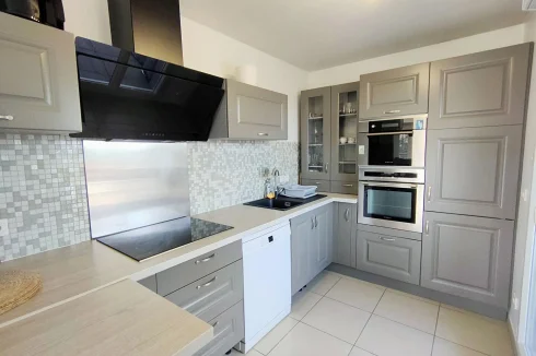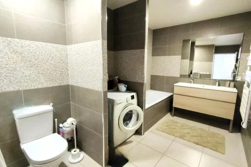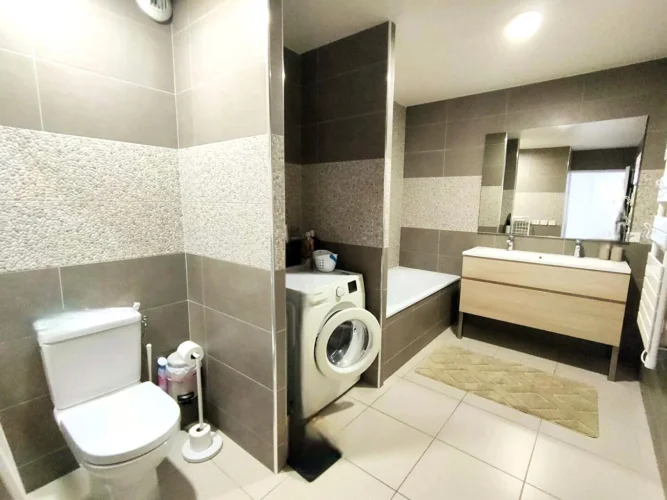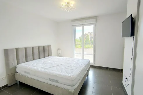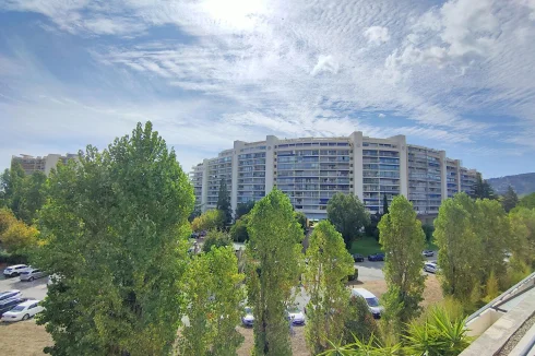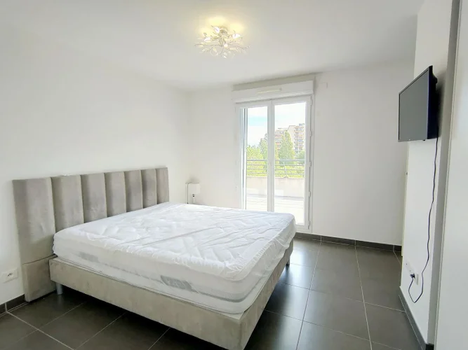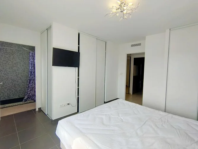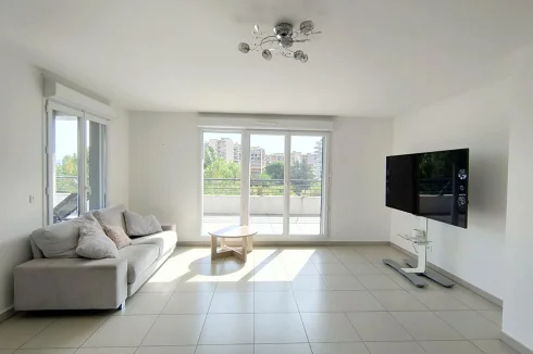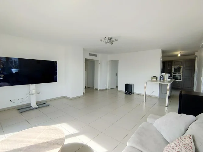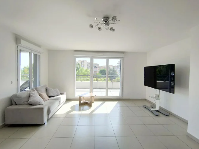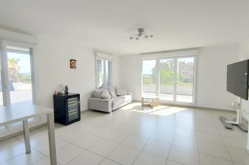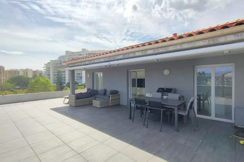 Rooftop apartment in excellent condition, approximately 91 sqm with the same terrace. Modern residence, reversible air conditioning (collective) throughout the accommodation. The apartment consists of an entrance opening onto a corridor where there is a separate toilet, the bathroom with toilet, 3 bedrooms including one with a shower room. All bedrooms have a storage closet. Large living room, separate kitchen, large terrace facing West / North / East. 2 closed garages in the annex.