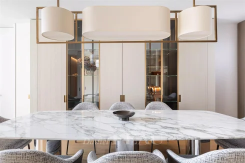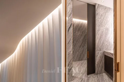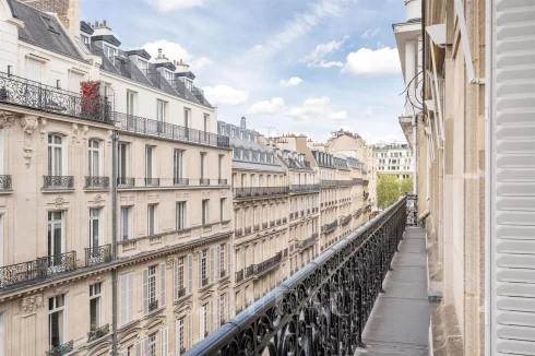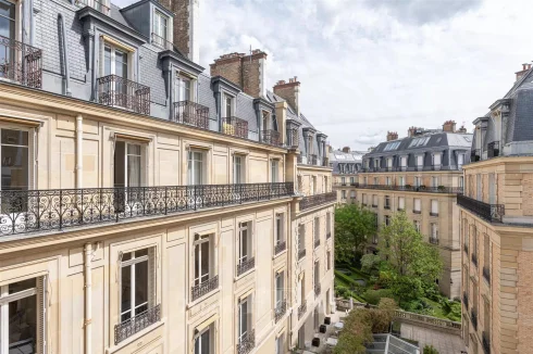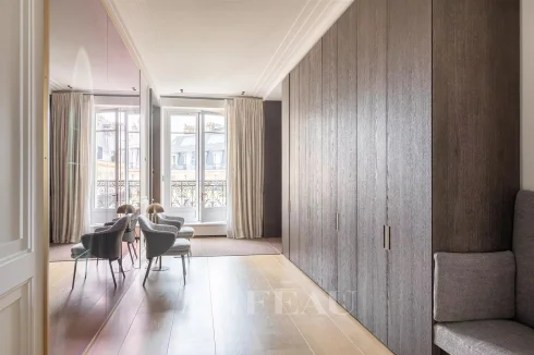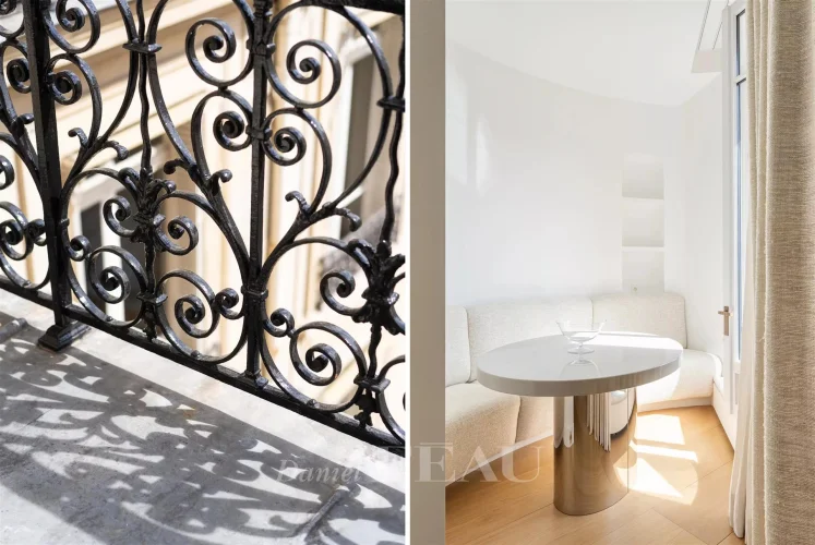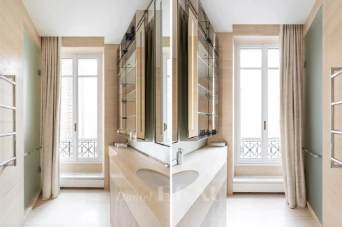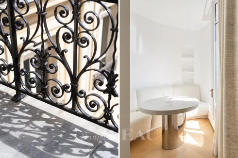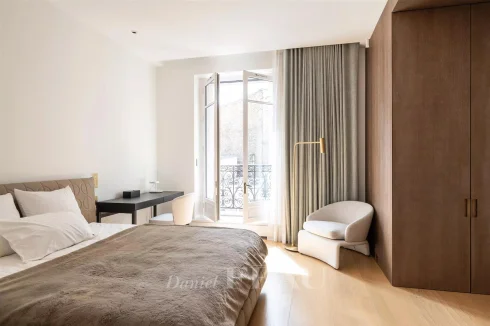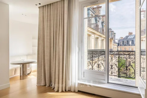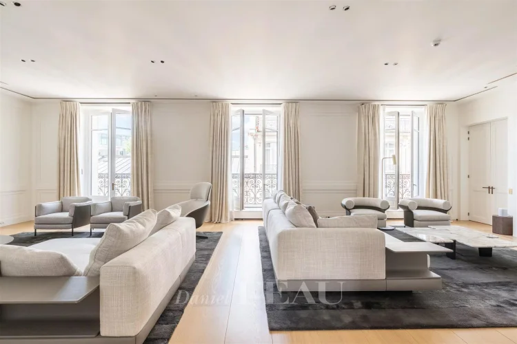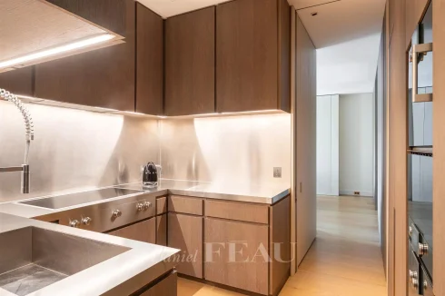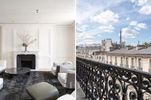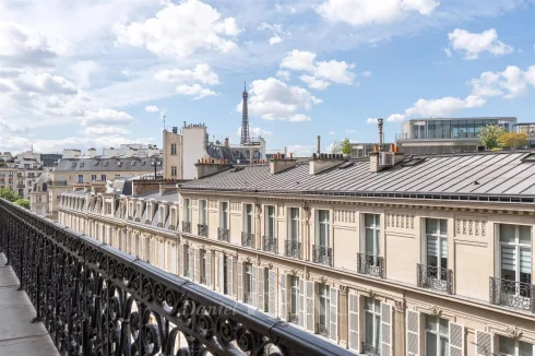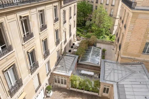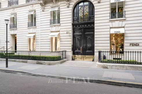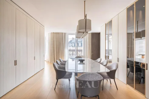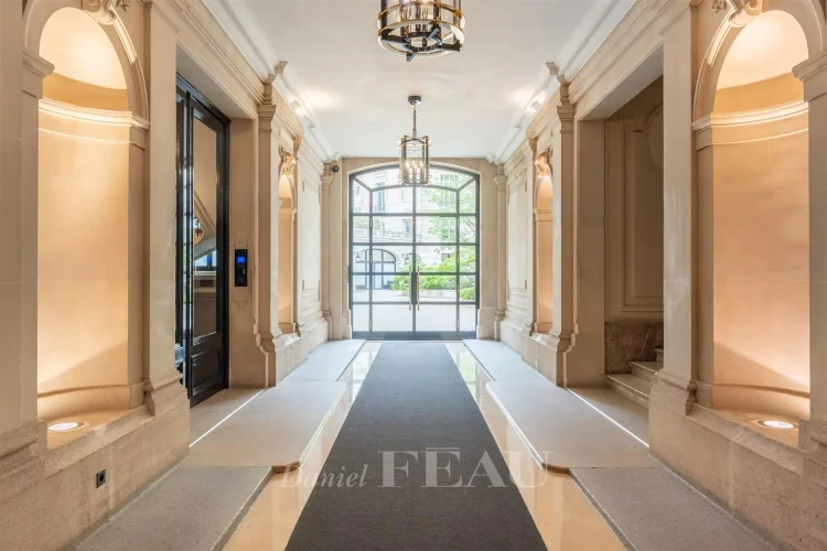 Sole Agent. Avenue Montaigne, in the heart of the capital’s prestigious Golden Triangle. This sumptuous apartment offering 345 sqm of dual-aspect living space bathed in sunshine and opening onto wide balconies enjoying open views over the rooftops of the Eiffel Tower is on the 4th floor of a magnificent late 19th century building with a lift and a 24/24 caretaker. Renovated throughout by renowned interior decorator Moinard Betaille, it includes an entrance hall, a spacious living/reception room with a fireplace, a study/library, a spacious dining room with an open-plan kitchen, a second fully equipped kitchen, a master suite with two shower rooms and a dressing room overlooking the co-ownership’s landscaped gardens, and three further suites each with a shower room and dressing room.