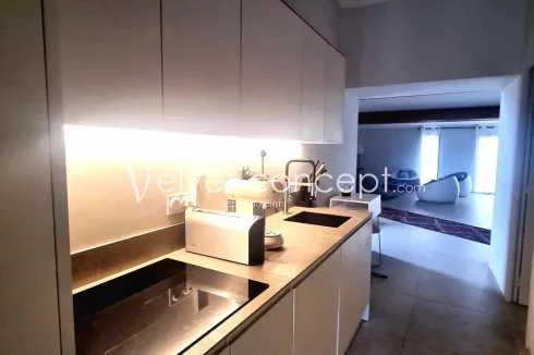 The heart of the home is a sophisticated open-plan living area. High ceilings with exposed beams add character, and the abundant natural light creates a welcoming ambiance. Perfect for both intimate family gatherings and entertaining guests, the dining area seamlessly connects to the living space. The modern kitchen is fully equipped, making meal preparation a delight.